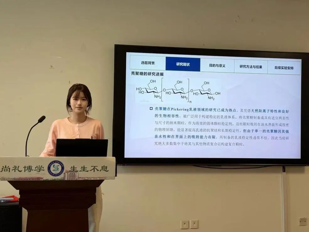 尹怡娜向大家介绍了《负载白藜芦醇的米肽-壳聚糖Pickering乳液构建及其脂肪替代特性研究》,该研究从分子相互作用到界面行为展开分析,建立 “复合颗粒组成→界面表现→乳液稳定性” 的清晰关联模型,并将高值且易氧化分解的营养素白藜芦醇包埋在 Pickering 乳液中,有望提高稳定性和生物利用度,从而为低脂食品增添额外的功能性。